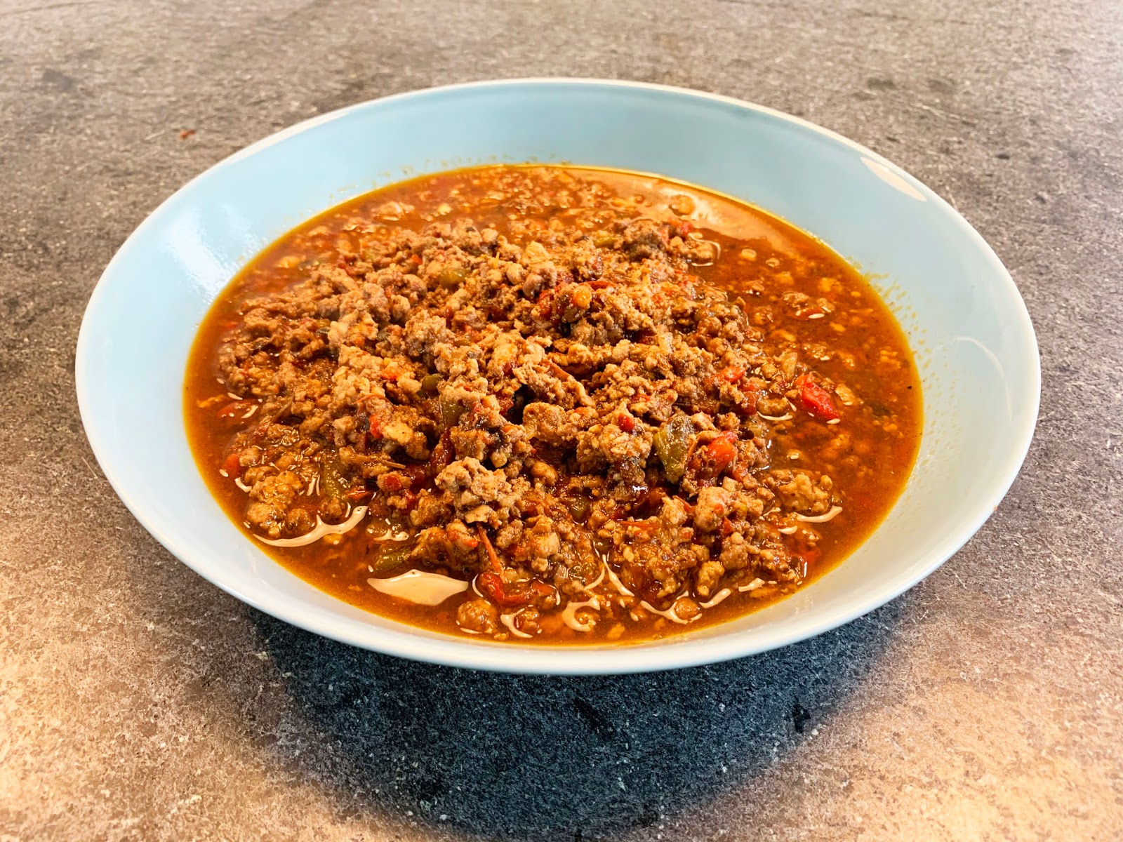 Skim extra grease. A couple of hours into the cook, there will likely be a substantial amount of grease on the top of the chili. I like to remove some of this before serving, so that the chili isn’t too greasy. There are probably fancy ways to do this, but I simply use a Chinese soup spoon to skim the fat off of the top. This time around I ended removing about 1.5 cups of fat.